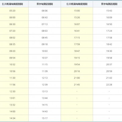 首尔站始发时间 | 仁川机场站到达时间 | 首尔站始发时间 | 仁川机场站到达时间 |