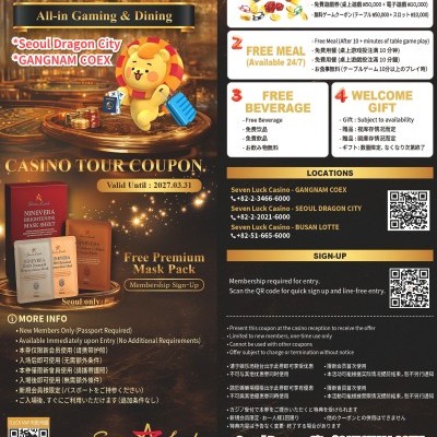 对于来韩国的国际访客,特别提醒您通过Trippose.com与七乐娱乐场(SEVEN LUCK CASINO - South Korea)的合作,享有专为外国人准备的独家优惠券。请务必利用这些独特的福利和服务,享受您在韩国的七乐娱乐场的美好时光!